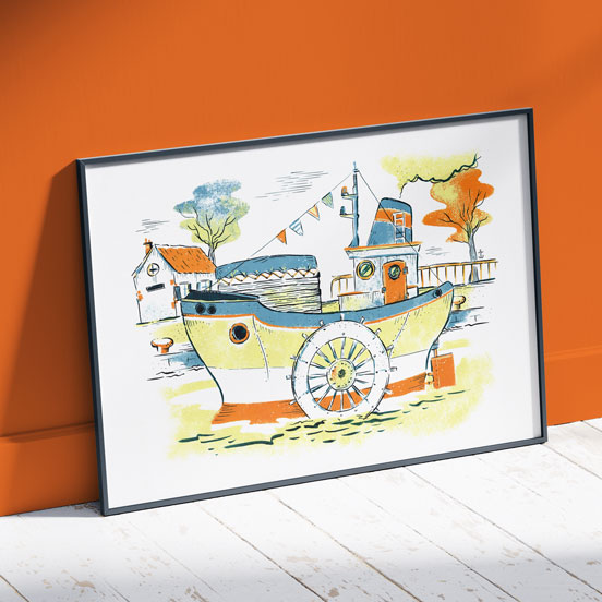 Illustration gouache en encre sur papier "Bateau à roues à aubes".